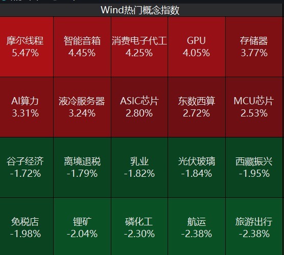 盘面上热点轮动加快。从板块来看,消费电子、存储芯片、贵金属等板块涨幅居前,影视院线、旅游、光伏设备等板块跌幅居前。具体来看,消费电子板块在利好消息的刺激下快速走强,立讯精密一字涨停。机器人板块延续强势,横河精密、万马股份等多股涨停。芯片产业链反复活跃,德明利2连板续创历史新高。液冷服务器概念股盘中震荡拉升,工业富联大涨续创历史新高。