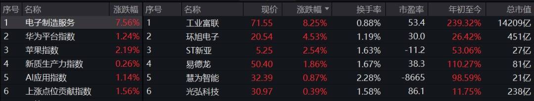 电子制造服务板块大涨7%,成分股全线上涨,工业富联逆势大涨8%,股价首次突破70元大关,总市值突破1.4万亿元。
