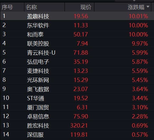 盈趣科技、东华软件、和而泰、联美控股涨停,青云科技、弘信电子、奥飞数据等跟涨。